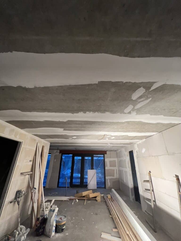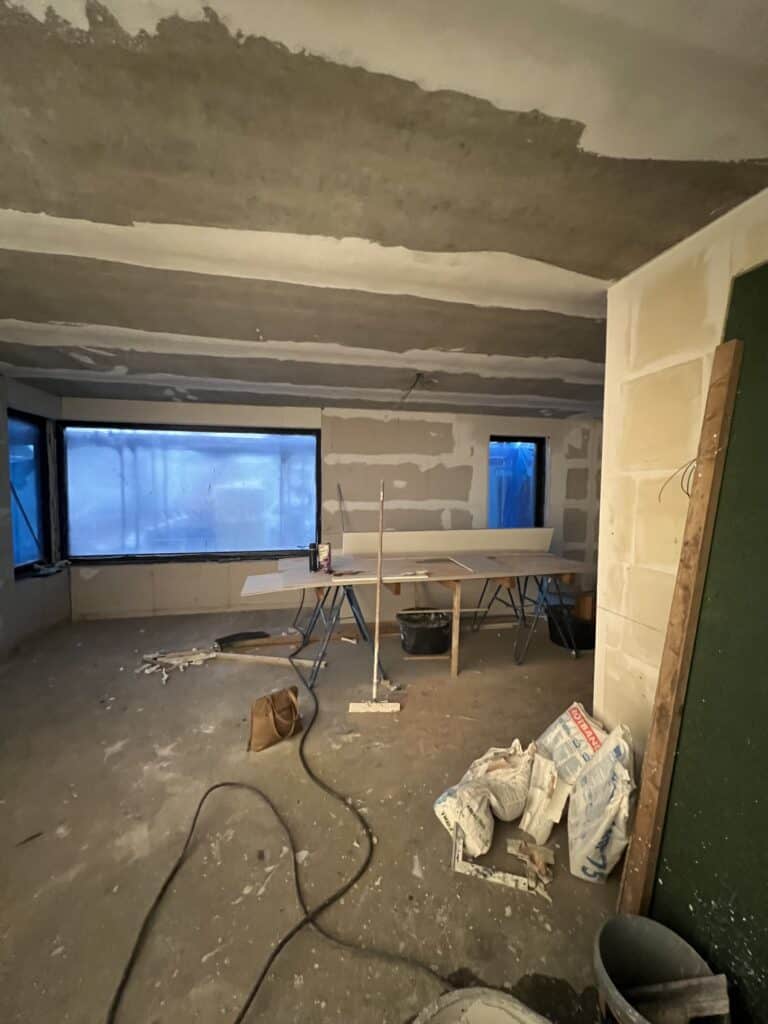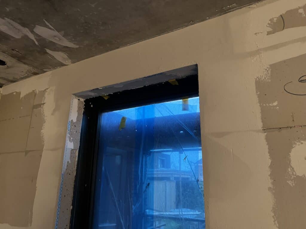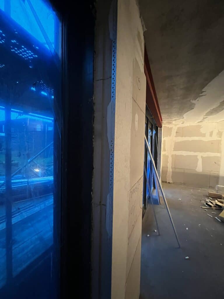 Het plafond in de beneden verdieping is dicht gezet en intussen is hij met de ramen bezig. Door een hoekprofiel te plaatsen, kan daar strak tegenaan worden gestuct.