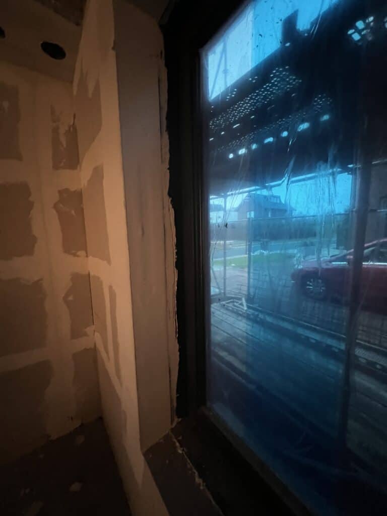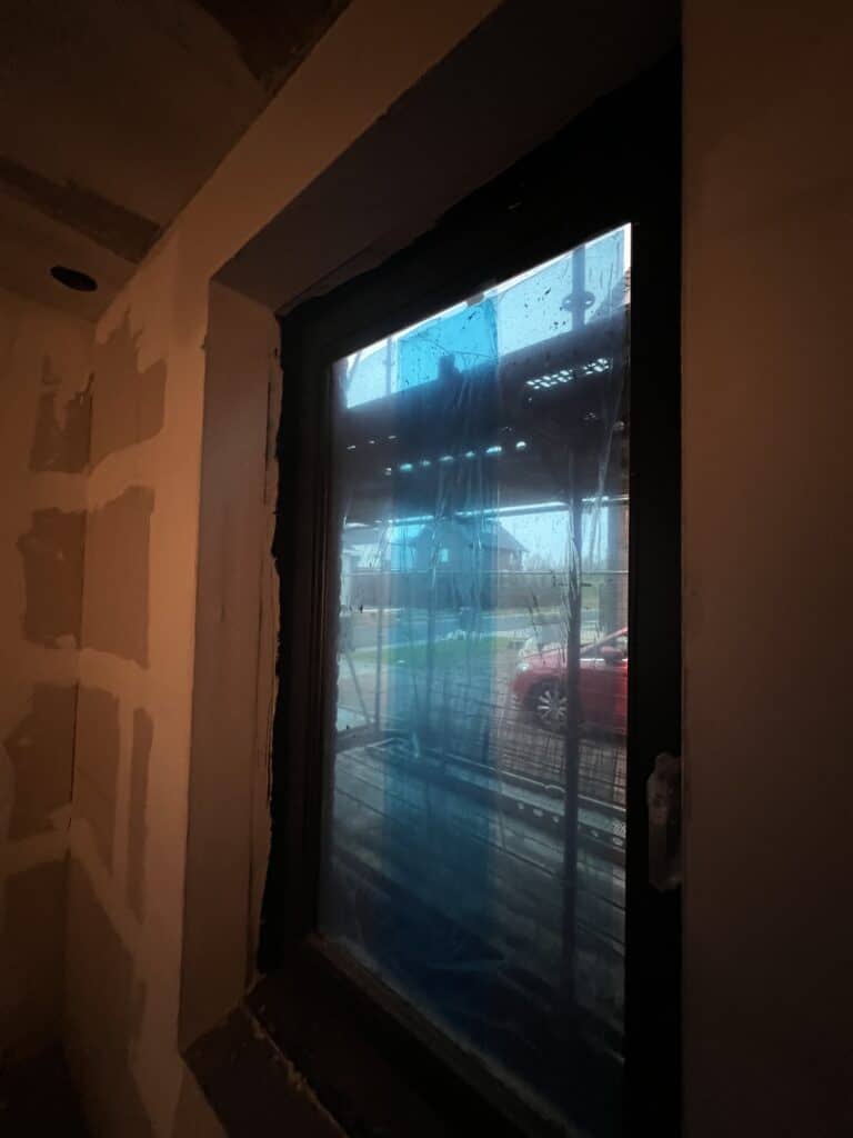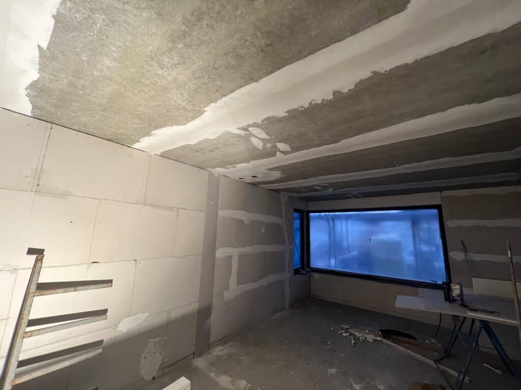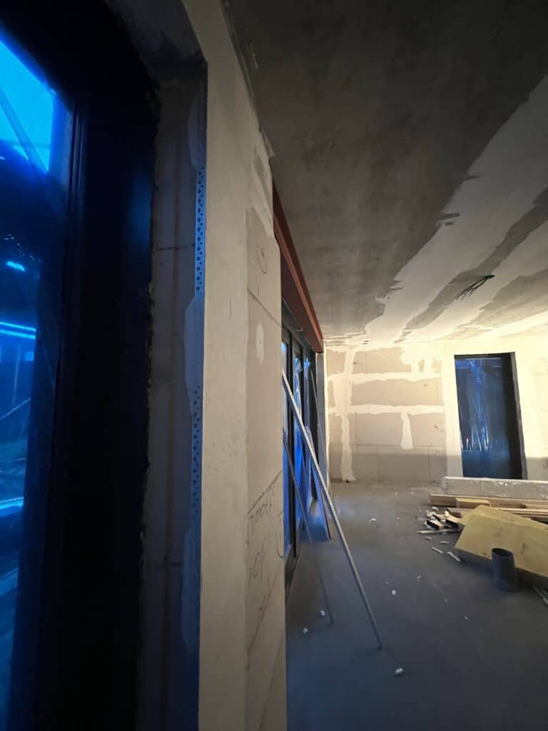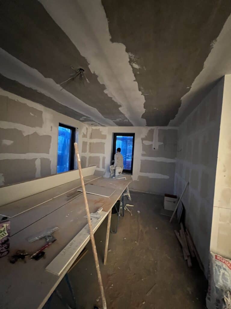 Het plafond in de beneden verdieping is dicht gezet en intussen is hij met de ramen bezig. Door een hoekprofiel te plaatsen, kan daar strak tegenaan worden gestuct.