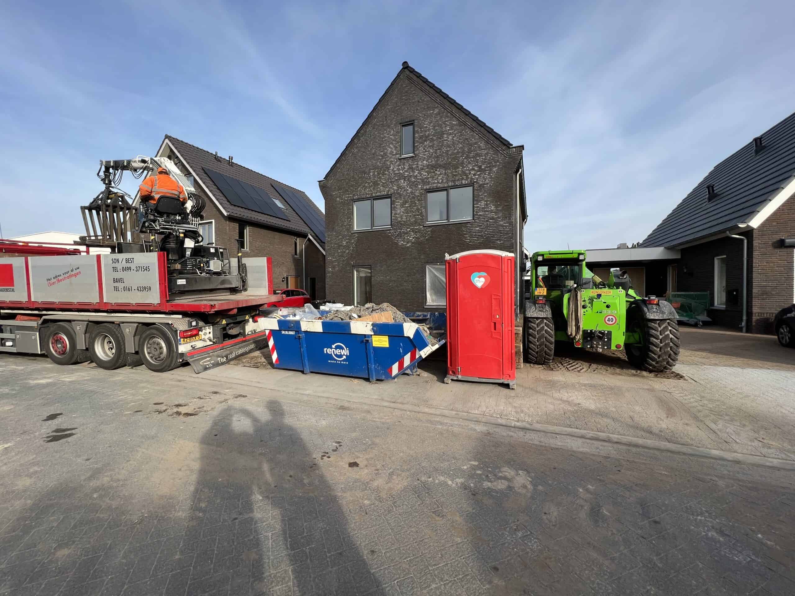 Buiten werden de tegels voor de oprit geleverd en huurden we een verreiker om het solid surface bad naar binnen te steken (tip: zorg dat je zo’n bad op tijd besteld en hem naar boven kunt zetten op het moment dat de trappen nog niet gezet zijn. Of laat hem erin takelen voordat de vloer of het dak erop liggen zodat je niet hoeft te sjouwen).